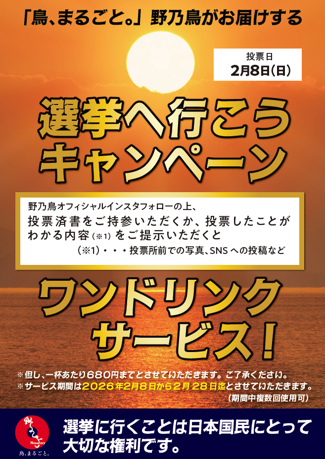 投票済書をご持参いただくか、投票したことがわかる内容(※1)をご提示いただくと(※1)投票所前での写真、SNS への投稿などでワンドリンクサービスいたします!